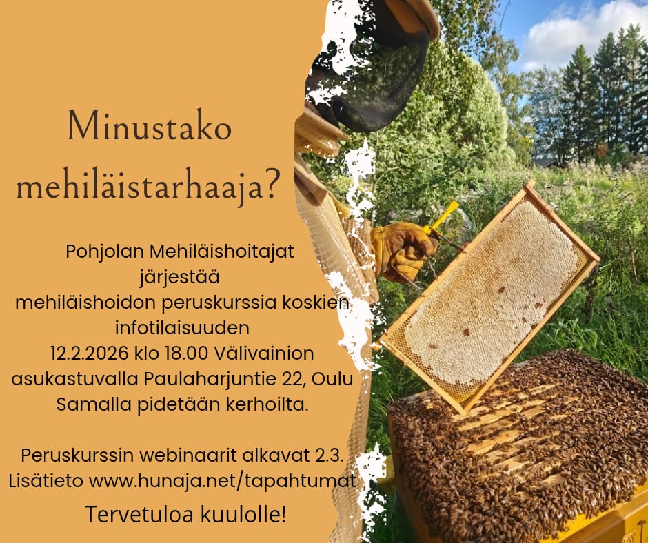 Tänä keväänä järjestetään mehiläistarhurin peruskurssi alkaen 11.3.2024 Oulussa. Ilmoittautuminen helmikuun loppuun mennessä. Teoriaosuus 11.3.–9.4., käytännön harjoittelu touko-elokuussa 2024. Kurssin hinta 135 euroa.